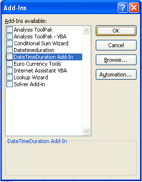 - Click Browse… and browse for the DateTimeDuration.xll file that you unzipped in step 2: