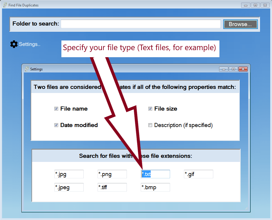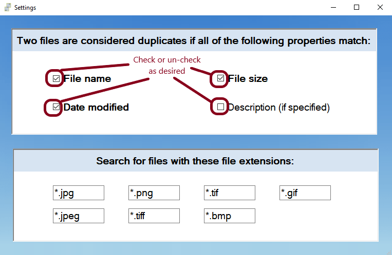 - To customize your definition of a duplicate, check/uncheck the file properties that will be examined, as follows: