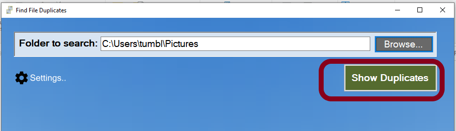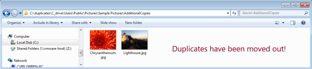(NOTE: Only the “extra” duplicates get moved, not the “original” files. In this example, the “extra” duplicates have been moved to the C:\duplicates folder)