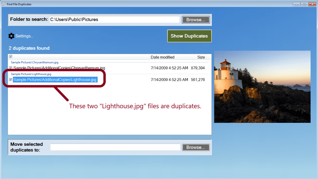 - The results are grouped to show which files are duplicates of each other. In this example, there are two Lighthouse.jpg files in different subfolders, and they are duplicates of one another. Optionally, highlight the file for a preview: