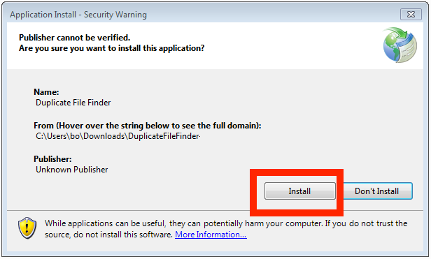 - Unzip the DuplicateFileFinder.zip file, then double-click the setup.exe file. You might receive several Security Warnings. Proceed as follows:
