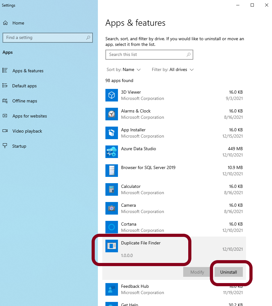 - Scroll and select Duplicate File Finder, then click Uninstall:
